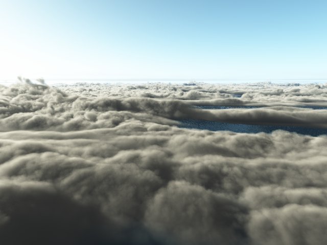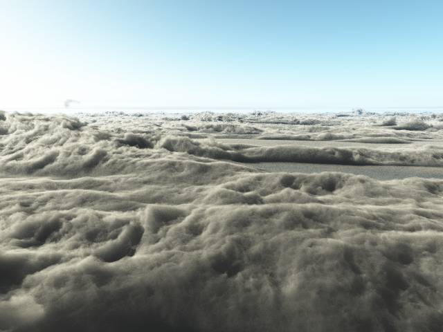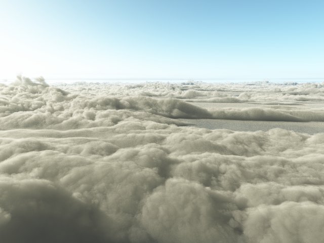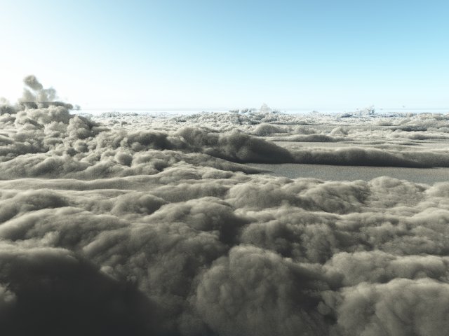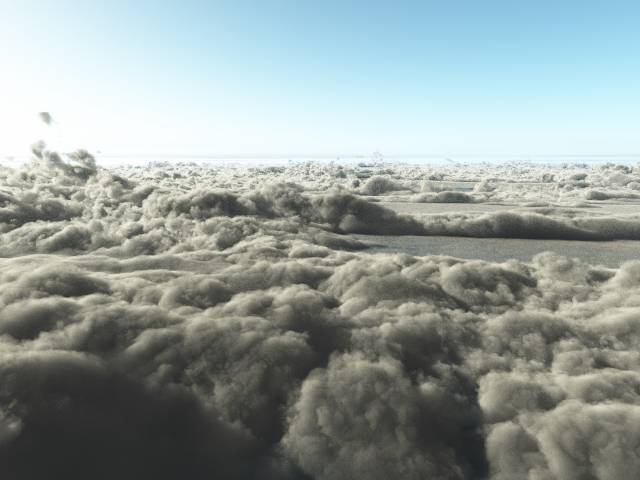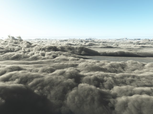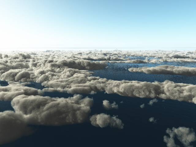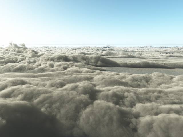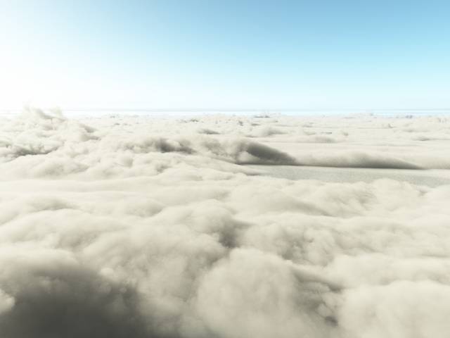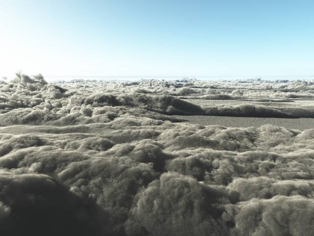 *前回の続き 左の画像とパラメータ設定をデフォルトとした場合の各パラメータ変化 以下:各パラメータ変化後の画像 大気の層の高さが変化する。 この場合はカメラの遥か上に層が移動した。 雲の層の厚みを変化させる。 低すぎると下のcoverが100%でもところどころ隙間が見えるようになる。 雲の出現領域を変える。 100%で全域、0%で完全に無くなる。 dencity(密度)を変化させる。 数値が低いほど霧掛かった見た目になる。 opacity(不透明)を変化させる。 下げれば光の透過率が変わりその分、雲が明るく見える。 sharpness(鮮鋭度)を変化させる。 高ければ雲のモコモコの部分がハッキリと描写されるが高過ぎるとノイズが混じったようになってしまう(下図 層の凹凸の度合いを変化させる。 同上 注:Shadowdensity(影の密度)は雲だけでは変化が判りませんが、他の物体を雲の下などに置けばその物体に落ちる影の濃度が変わります。 特に説明するまでもなく見ればはっきり判るものからそうでないものまで様々。 パラメータの大体の意味を掴んでも目的の雲っぽさを追求しようとすると結局は何度もパラメータを変化させ試行錯誤を繰り返しますので、完璧に覚えずとも良いのではないでしょうか。 |