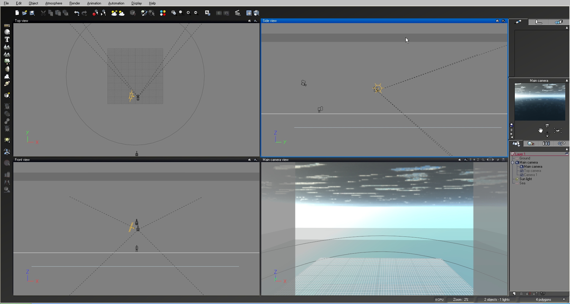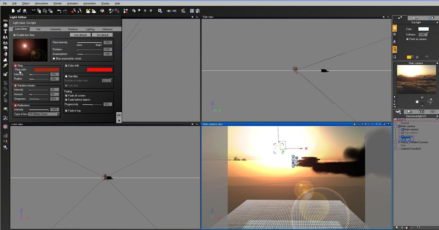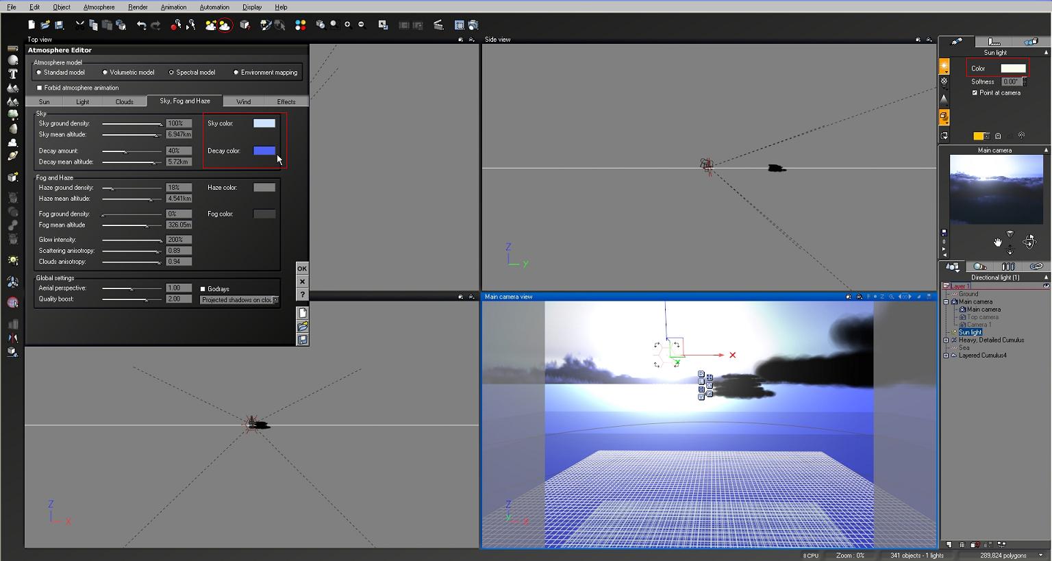 *前回の続き 左の画像とパラメータ設定をデフォルトとした場合の各パラメータ変化 以下:各パラメータ変化後の画像 大気の層の高さが変化する。 この場合はカメラの遥か上に層が移動した。 雲の層の厚みを変化させる。 低すぎると下のcoverが100%でもところどころ隙間が見えるようになる。 雲の出現領域を変える。 100%で全域、0%で完全に無くなる。 dencity(密度)を変化させる。 数値が低いほど霧掛かった見た目になる。 opacity(不透明)を変化させる。 下げれば光の透過率が変わりその分、雲が明るく見える。 sharpness(鮮鋭度)を変化させる。 高ければ雲のモコモコの部分がハッキリと描写されるが高過ぎるとノイズが混じったようになってしまう(下図 層の凹凸の度合いを変化させる。 同上 注:Shadowdensity(影の密度)は雲だけでは変化が判りませんが、他の物体を雲の下などに置けばその物体に落ちる影の濃度が変わります。 特に説明するまでもなく見ればはっきり判るものからそうでないものまで様々。 パラメータの大体の意味を掴んでも目的の雲っぽさを追求しようとすると結局は何度もパラメータを変化させ試行錯誤を繰り返しますので、完璧に覚えずとも良いのではないでしょうか。 |