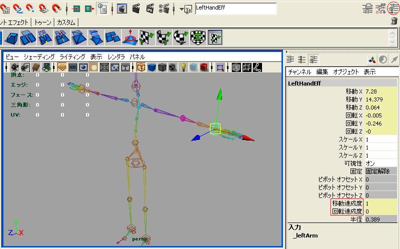 移動の固定・回転の固定を設定した場合、他からの影響を受けなくなります。 初期状態では足首の部分は両方固定になっていると思います。 固定させる部位は主に手首や足首が多くなるでしょう。 解除:球 移動固定:四角 回転固定:半球 全て固定:四角+半球 使用用途としては梯子などを昇るモーションを作る際に手を掛け次の段に手を伸ばすとした場合、掴んでいる手は固定されていないといけません。 そういった時に固定を選択する事によって手のズレを無くし、自然なアニメーションを作る事が出来るかと思います。 注意点として、この固定パラメータはポーズを決める際のeffに関連するジョイントの固定状態です。 アニメーションを再生した時は達成度が評価されます。 自分も最初はよく判らなかったものですし、こうやって言葉で書いても中々伝わる部分では無いでしょう。 詳しくは下記のブログなどを参考にして下さい。 FBIKに関して他にも詳しく載っています。 http://blog.livedoor.jp/kohta0130/ 巧く説明出来そうだと思えばまた改めて記事を書きます。 その他、FBIKのアニメーション製作はどういった感じになるのかというと下の動画の様な流れで製作していきます。 自分はアトリビュートでの数値変更やアニメーションカーブでキーを打つ事が多いのですが。 それだとmayaアニメーションをやった事無い人には意味不明な動画になってしまうので、今回は大まかにeffを動かして設定しました。 ---------------------------------------------------------- 注:単純な歩行アニメーション作成。 無音で特に詳細な説明も無いのでつまらないです。 「3Dアニメーションはどんな流れで作るのか?」を知る程度に見て下さい。 完成アニメーション再生は2:30から。 ---------------------------------------------------------- ・作成手順 1.体の部位にあるeff(エフェクタ)を適当に動かす。 2.キーボードsキーを押してアニメーションキー作成。 3.1と2を繰り返す。 4.ポーズが出来上がったらタイムラインを動かして次のポーズを設定していく。 5.全てのタイムライン(今回は10F毎に設定)でキーを作成したら右下のアニメーション再生ボタンを押して確認。 基本的にはこの後に調整するフレームの間を短くして微調整する作業に繋がると思います。 アニメーションにしろプログラムにしろ、出来上がるものは華やかだったりしますが作成は以外に地味な事の繰り返しです。 キャラクターを用意して動かすようになるとまた違った一面を感じる事が出来る事でしょうが、中々そこまで到達するのも難しかったりします。 用語説明------------------------------------------ ・アニメーション(ファンクション) カーブ オブジェクトのアニメーションを線形グラフであらわしたもの。 上のメニューバーのウィンドウ→アニメーションエディタ→グラフエディタを開くとアニメーション内容が線形で表示されます。 加速の調整や微細な動きの調整にとても有用な機能。 ・アトリビュート 右側に表示される様々なパラメータ。 オブジェクト毎に存在していてmayaの情報量は他のソフトと比べても多いレベルなので必要なものから覚えていきましょう。 右上のゴミ箱上の三つのボタンが有りますが、その一番左のボタンで表示/非表示の切り替えが可能。 ------------------------------------------------------ |