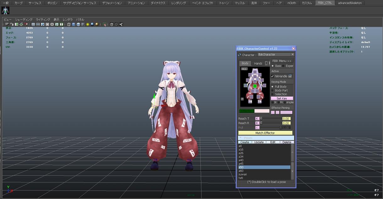 「FBIK CharacterControl 」というFBIKのeff(エフェクト)をGUIで選択し易くしたものです。 FBIKであれば以前紹介したように作成した後、スクリプトを実行すると自動的にパラメータを拾ってくれるので簡単に作業に入れます。 配布場所は海外のサイト「creativecrash」です。 ダウンロードには無料メンバー登録が必要なので、そういった登録に不安を感じてしまうという方は気を付けて下さい。 ・FBIK CharacterControl http://www.creativecrash.com/maya/downloads/scripts-plugins/character/c/fbik-charactercontrol/comments インストール手順はマイドキュメントに作成されているmayaフォルダの「script」「spresets」「prefs」にそれぞれ必要なファイルを入れていきます。 詳しくはダウンロードしたファイルの中にtxtが入っていると思いますのでそちらを読んで下さい。 使い方は「Autodesk モーションビルダー」を知っている方ならピンと来るかも知れませんが、ほとんどそれに類似した作りになっています。 ウィンドウ絵の右手の四角をクリックすれば右手のeffが選択されるといった感じです。 固定や達成度を直ぐに切り替えられるのも作業効率upに繋がるでしょう。 その他、ポーズを作成した後に下の「create」をクリックすれば名前を入力してポーズが保存出来ます。 それをダブルクリックすれば直ぐにそのポーズに変更する事が可能です。 Maya2009-2011での動作は確認しましたが特に調整する事無く使用出来ました。 HumanIKの方では使えないので注意して下さい。 |